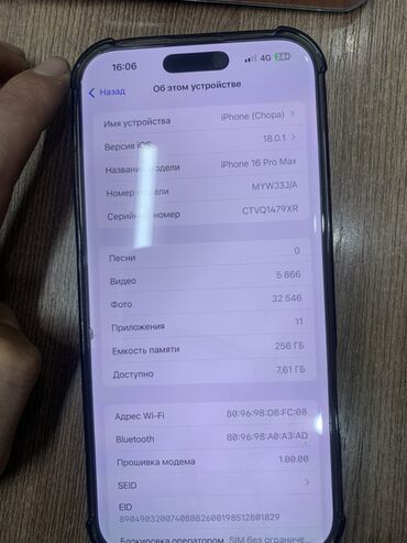 IPhone 16 Pro Max, модель MYWJ33J/A. Память 256 ГБ, доступно 7,61 ГБ на момент снимка. iOS 18.0.1. Экран с динамическим островом, корпус в защитном чехле на фото.
