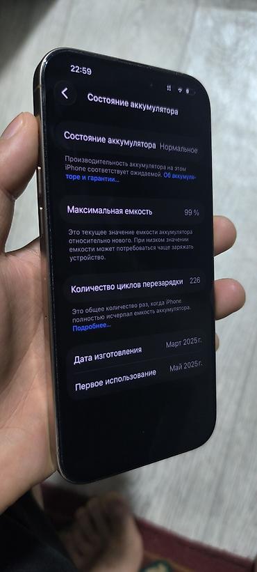 - Батарея: максимальная емкость 99%, количество циклов перезарядки 226.