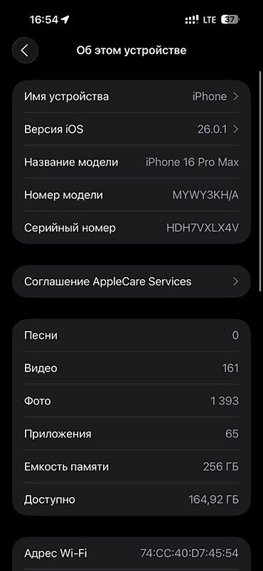 - Память: 256 ГБ (доступно 164,92 ГБ на момент скриншота)