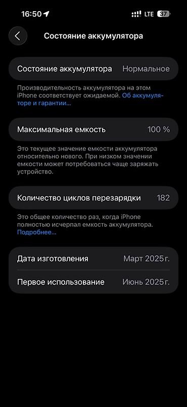 - Аккумулятор: максимальная емкость 100%, количество циклов перезарядки 182 (по разделу “Состояние аккумулятора”)