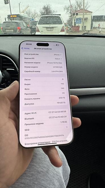 IPhone 16 Pro Max, 256 ГБ, цвет тёмно‑серый (Titanium). На скриншотах «Об этом устройстве» указано: - Модель: iPhone 16 Pro Max (номер модели MYWV3KH/A) - iOS: 26.2.1 - Память: 256 ГБ (доступно ~22...
