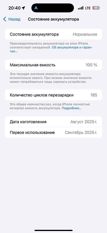 - Аккумулятор: максимальная емкость 100%, количество циклов перезарядки — 185 (по скриншоту «Состояние аккумулятора»).