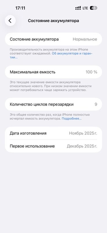 - Аккумулятор: максимальная ёмкость 100%, количество циклов перезарядки — 9; состояние — «Нормальное»