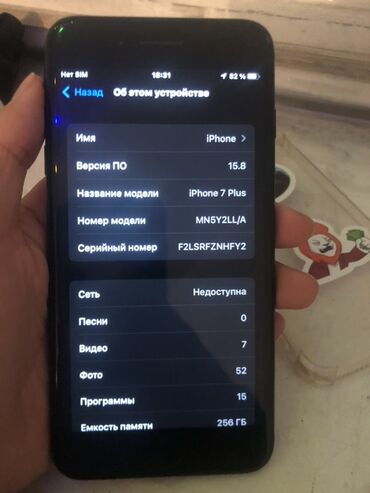 На устройстве: 7 видео, 52 фото, 15 программ; слот SIM свободен, аккаунт не привязан (экран «Вход на iPhone»). Серийный номер: F2LSRFZNHFY2.