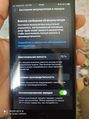 - iOS установлен; на экране показано: емкость аккумулятора 79%, оптимизированная зарядка включена, устройство поддерживает нормальную пиковую производительность