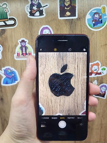 - Корпус: стеклянная задняя панель красного цвета с логотипом Apple; видимы трещины на заднем стекле, особенно в нижнем правом углу