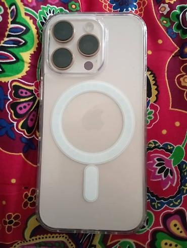 - Модель из линейки с вырезом Dynamic Island и тройной основной камерой. Корпус светлого (бежево‑золотистого) цвета.