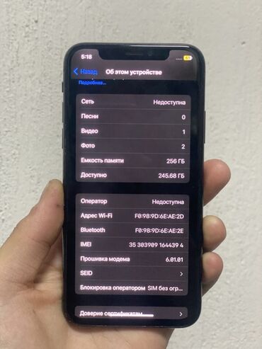 - На скриншоте «Об этом устройстве» отображается емкость 256 ГБ, оператор не привязан (SIM без ограничений)