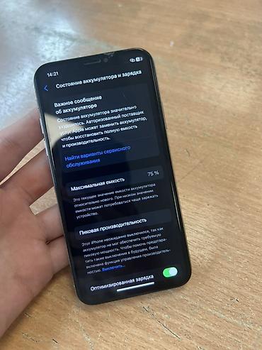 - Аккумулятор: в разделе «Состояние аккумулятора» отображается максимальная ёмкость 75%, включено «Оптимизированная зарядка»; показано уведомление о необходимости сервисной замены для восстановления полной ёмкости