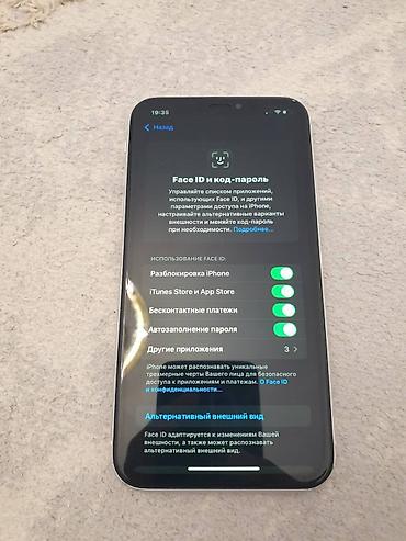 Телефон полностью настроен, работает Face ID, True Tone активен. На скриншотах – разделы «Об этом устройстве», «Face ID и код‑пароль», «Состояние аккумулятора». Компактный и быстрый iPhone с надёжной экосистемой и большим объёмом памяти.