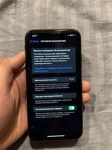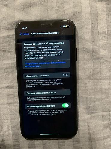 - Аккумулятор: максимальная ёмкость 78% (сообщение о необходимости обслуживания отображается в настройках; пиковая производительность нормальная, включена оптимизированная зарядка)
