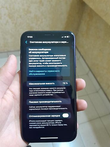 - Аккумулятор: максимальная ёмкость 78% (есть уведомление о необходимости сервисной замены; пиковая производительность поддерживается, оптимизированная зарядка включена — см. скрин)