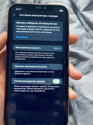 - Показано меню «Состояние аккумулятора»: максимальная ёмкость 100%; есть системное сообщение о невозможности проверить подлинность аккумулятора.