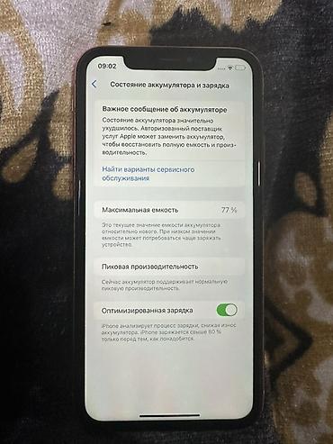 - Аккумулятор: в настройках отображается сообщение о необходимости обслуживания; максимальная ёмкость 77%, включена оптимизированная зарядка
