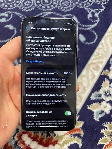 - Аккумулятор: в настройках указана максимальная ёмкость 100%; присутствует уведомление «Не удаётся проверить подлинность аккумулятора Apple».