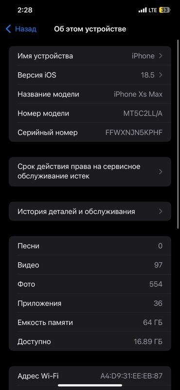 - Память: 64 ГБ, доступно 16,89 ГБ (на момент скриншота)