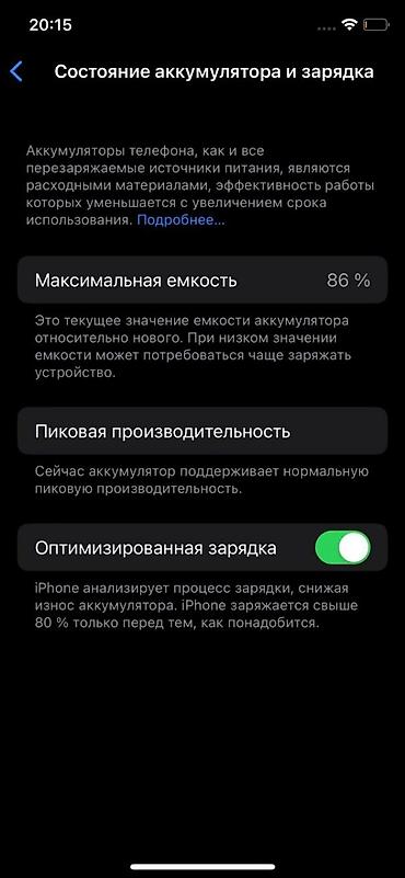 - Аккумулятор: максимальная ёмкость 86% (скриншот в галерее), пиковая производительность нормальная, включена «Оптимизированная зарядка».