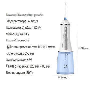 Компактный ирригатор для полости рта AOW03 с большим съемным резервуаром 350 мл и защитой от воды IPX7. Подходит для ежедневной гигиены, брекетов, имплантов и чувствительных десен.