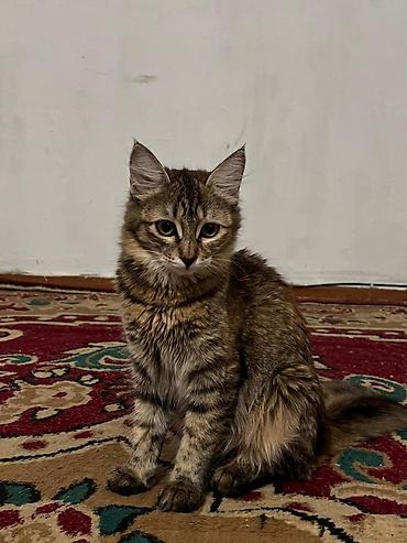 - Тигровая кошечка: коричнево‑серый табби с «подпалом», выразительные большие глаза, мягкая полудлинная шерсть, объёмный хвост‑метёлка.