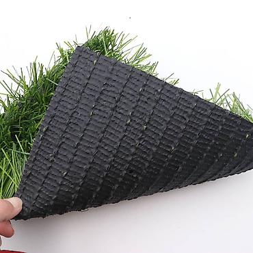Искусственная трава с коротким, плотным ворсом зеленого цвета, имитирующая натуральный газон. Волокна травы имеют различный оттенок зеленого, что придает покрытию естественный вид. Основа покрытия выполнена из прочного черного материала, обеспечивающего стабильность и долговечность. Подходит для использования на детских площадках, спортивных сооружениях, в ландшафтном дизайне и для декоративных целей.