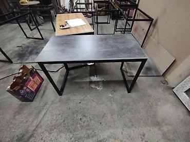 Стол с прямоугольной столешницей серого цвета, имитирующей текстуру камня. Металлический каркас черного цвета обеспечивает устойчивость и минималистичный вид. Подходит для использования в качестве ...