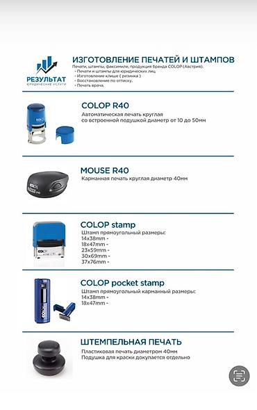 Изготовление печатей и штампов под ключ. ЦЕНА На обычной оснастке - 800 сом На автоматической оснастке-1400сом Что предлагаем: - Печати д...