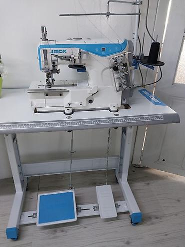 Промышленная распошивальная швейная машина JACK (плоскошовная, coverstitch) на столе. Характеристики и комплектация: - Тип: трехигольная/двухигольная плоскошовная машина для распошивочного шва (ни...