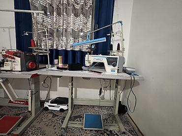 - Прямая строчка JACK с электронным блоком управления, сенсорной/кнопочной панелью, позиционером иглы и сервоприводом. На столе установлен светильник на штанге, нитковод с несколькими катушкодержателями, коленоподъемник, педальный узел. Есть линейка-разметка на столешнице.
