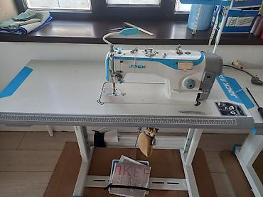- Прямая строчка JACK (одиночная игла) на отдельном промышленном столе с педалью, коленоподъёмником, нитеводом на стойке и встроенной линейкой по кромке столешницы. Предназначена для высокоскоростной прямой строчки, пошива деталей, стачивания и отделочных строчек на платьях, блузах, брюках и т. п.