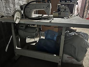 Промышленный швейный пост на столе: прямострочная машина JACK + 5‑ниточный оверлок VEGA.