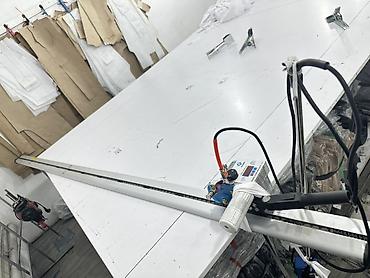- Раскройный стол с продольной направляющей и электрическим настольным раскройным ножом на каретке (рейка с зубчатой передачей, блок питания/управления, рукоять с кнопкой). Удобен для точного раскроя настилов и длинных деталей.