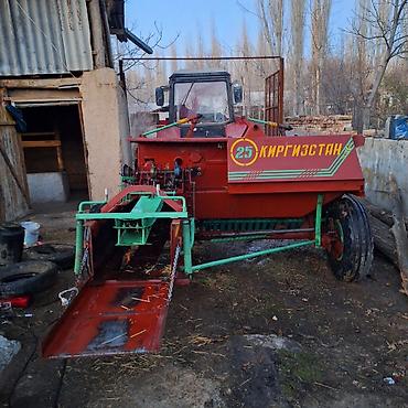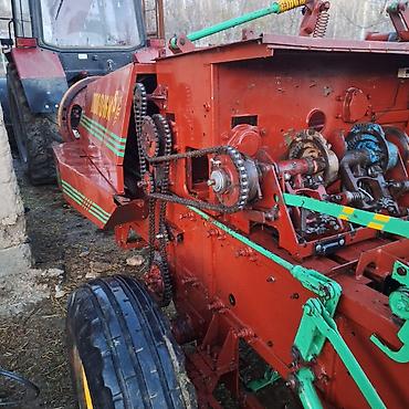 Прицепной пресс-подборщик красного цвета, предназначенный для сбора сена. Оснащен большим маховиком и имеет прочную металлическую конструкцию. Подходит для эффективной заготовки кормов на фермерски...