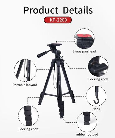 Штатив также имеет ручку для управления наклоном и поворотом, что обеспечивает гибкость и контроль над углом съемки. Эти функции делают Jmary KP-2209 отличным выбором для профессионалов и любителей, которые нуждаются в надежном и функциональном штативе для создания качественных фотографий и видео.
