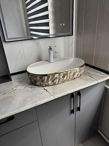 - Санузел/умывальная зона с мебелью: столешница под мрамор, накладная раковина овальной формы с декоративным кантом, однорычажный смеситель.