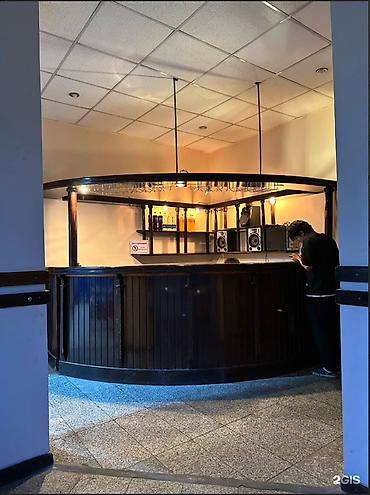 - Зал с барной стойкой полуовальной формы, подвесными держателями для бокалов, полками для напитков и акустикой.