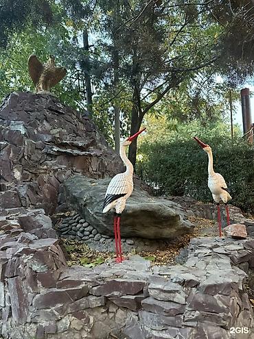 - Благоустроенная зеленая территория: мощеные дорожки, деревья, декоративные композиции из камня и фигур птиц — место для фото и отдыха на свежем воздухе.