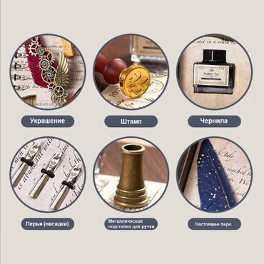 Отличный подарок на день учителя! Этот набор состоит из: потрясающей перьевой ручки с настоящим пером, воска, штампа, подставки под ручку, набора перьев различной толщины и, конечно же, чернил.