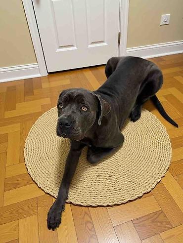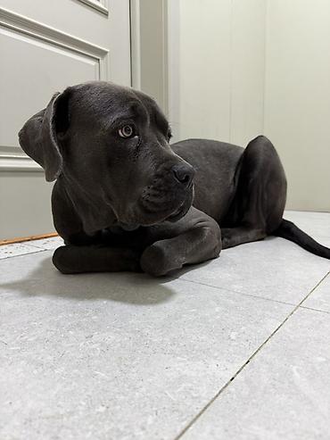 Кане-корсо, окрас серо-графитовый (blue). Крупный, статный пес с мощным костяком, широкой грудью и выразительной головой. Гладкая короткая шерсть, уши висячие. Глаза янтарно-карие, взгляд внимательный. Вес 43 килограмма, рост в холке 63 см