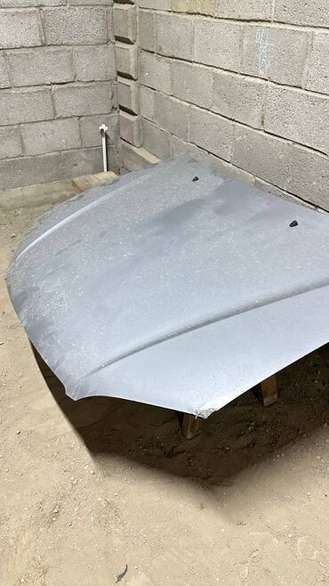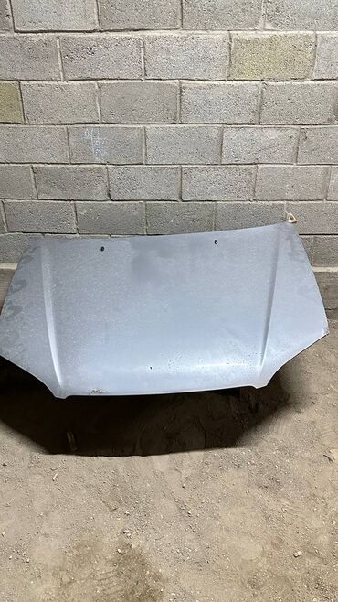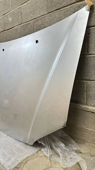 Капот автомобиля, белый, с центральной вентиляционной вставкой/жалюзи. Материал — металл. На правой стороне имеется участок с сильными повреждениями и трещинами, по поверхности видны царапины и сле...