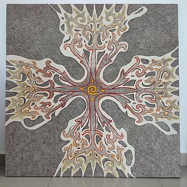 Тёплая палитра (огненно-красные, золотистые , жёлтые и мягкие серые оттенки) создаёт ощущение энергии, движения и жизни. Орнамент словно пульсирует, расходясь от центра — как источник света или внутренней силы человека.