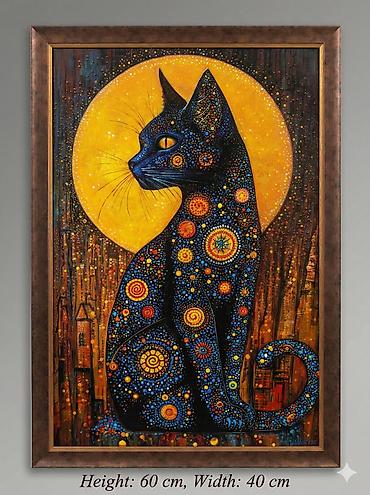 - Сюжет и стиль: профиль черного кота на фоне крупного золотого диска. Живописная поверхность с множеством точек и спиралей в сине-оранжевой гамме, декоративные орнаменты и мерцающие акценты создают эффект ночного неба и городского пейзажа.