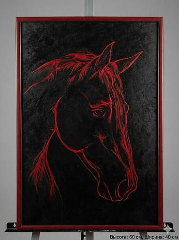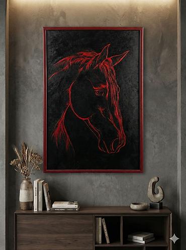- Техника: живопись/графика по темному фону с экспрессивными красными линиями, подчеркивающими силуэт головы лошади, гриву и контуры морды.