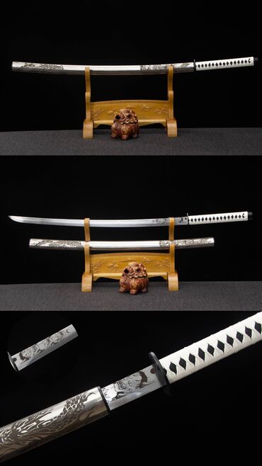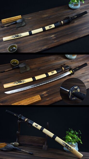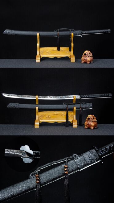 Все катаны ручной работы и идут в комплекте с подарочной деревянной коробкой и деревянной черной подставкой