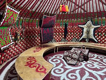 - Интерьер: круговой низкий деревянный дастархан (секции-полуокружности с орнаментальной росписью), войлочные ковры и нарышки с казахским орнаментом.