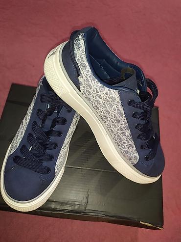 Кроссовки низкие, синие с бело-серым узором монограммы. - Верх: сочетание текстиля с принтом и вставок под нубук/кожу в темно-синем цвете. - Шнуровка: классическая, плотные тёмно-синие шнурки, ме...