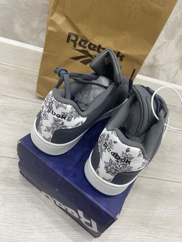 - Цвет: темно‑серый верх, белая подошва. Пятка и задние панели с белыми вставками и черным флоральным принтом Reebok.