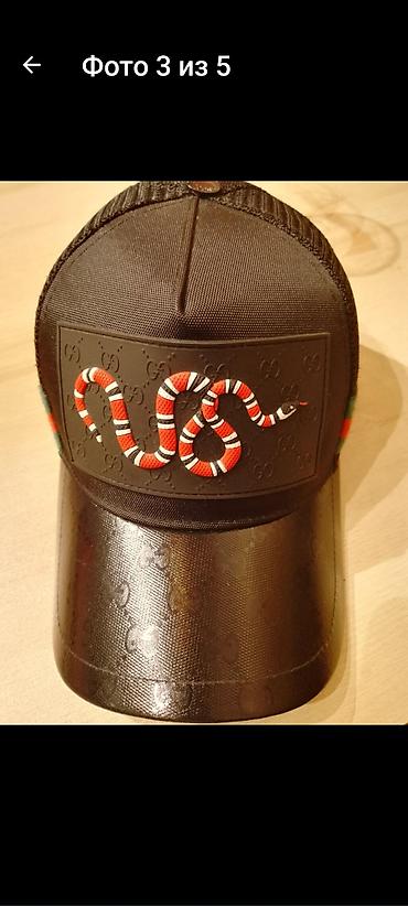 Черная кепка-бейсболка с фактурным логотипным тиснением и нашивкой спереди: на прямоугольной панели рельефная змея в красно-бело-черных цветах на фоне паттерна с повторяющимися двойными «G». Изогнутый козырек также с тисненым монограммным рисунком. Сетчатые боковые и задние панели для вентиляции, классическая шестиклинка, сверху — пуговица. По бокам видны полосы в зеленом и красном цветах. Регулируемая посадка на затылке.