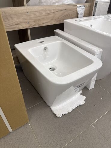 Белое керамическое биде с двумя отверстиями для установки смесителя и слива. Модель имеет прямоугольную форму с закругленными углами, что позволяет легко интегрировать ее в современный интерьер ванной комнаты. На задней части биде расположено крепление для настенной установки, что экономит пространство и упрощает уборку.