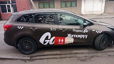 Kia Ceed SW — универсал с фирменным брендом «Яндекс Go Жеткируу» (доставка). Пятидверный кузов, увеличенный багажник, удобный доступ через широкую заднюю дверь. Цвет — темно‑коричневый/графит с контрастными наклейками сервиса, шахматными элементами и крупной надписью Go. На бортах нанесен номер 925. Черные легкосплавные диски, крыша со штатными рейлингами, задние парктроники. Салон рассчитан на 5 мест, практичный для перевозки грузов и посылок. Автомобиль подходит для работы в сервисах доставки/такси и брендирован под «Яндекс Go». Номерной знак: KG G3 925 AGS.