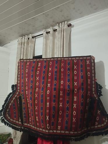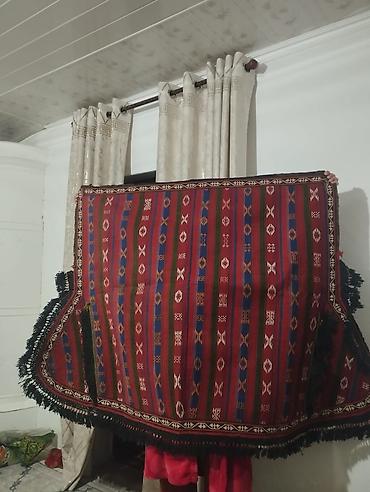 - Дизайн: продольные полосы в бордово-красной гамме с синими и оливковыми вставками; традиционные геометрические мотивы и символы по всей площади.